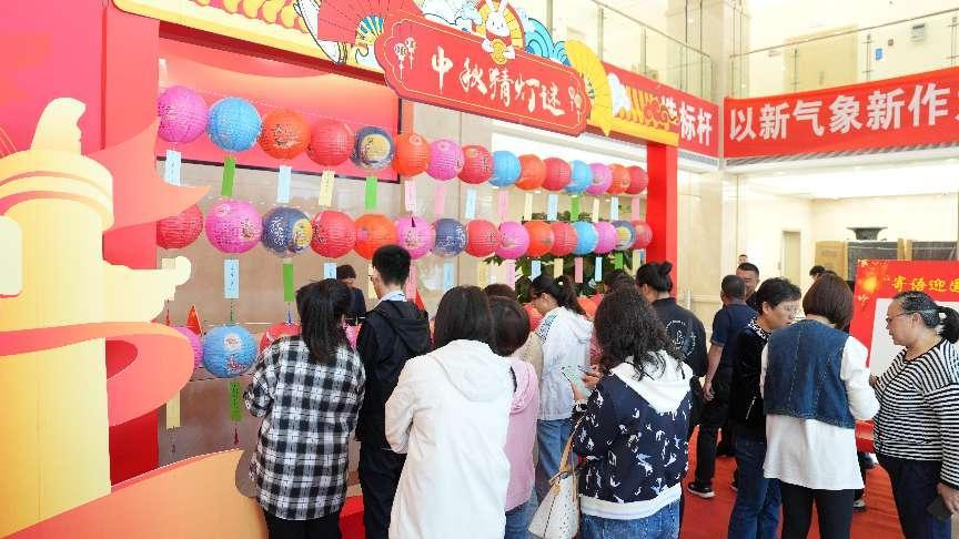 辦公樓大廳內,一個個精心設計的燈謎懸掛在一盞盞精致美觀的燈籠上,紅紅火火營造了濃厚的節日氛圍。謎語內容既有傳統字詞、成語典故,又有黨建知識、生活常識,新穎別致、妙趣橫生。干部員工們在五彩燈謎前駐足,爭先恐后、踴躍猜謎,一片歡聲笑語。
