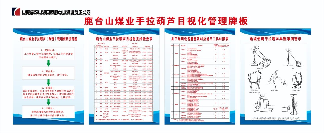 為了提高手拉葫蘆現場使用人員對使用流程、完好標準、吊具選用規格要求及常見違規案例現象的了解和掌握,鹿臺山煤業采用圖示的方式將手拉葫蘆使用流程圖、注意事項、錯誤案例示范等內容懸掛在醒目位置,實行了現場目視化看板管理,為現場使用人員提供了可靠的流程指導、使用規范、完好標準和工具選用參考引導,進一步規范了使用操作行為,提高了標準化流程化作業水平。
